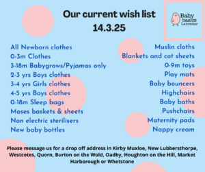Essential funds are always needed to continue the vital work we do. Funds cover items such as rent, bills, wages for our 2 part time staff, items we are short of for referrals and general day to day running of Baby Basics Leicester.