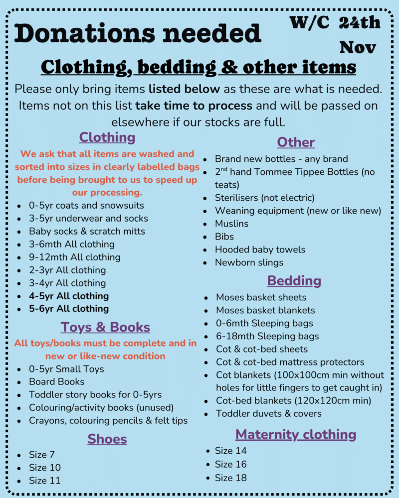 Please only bring items listed below as these are what is needed. Items not on this list take time to process and will be passed on elsewhere if our stocks are full.